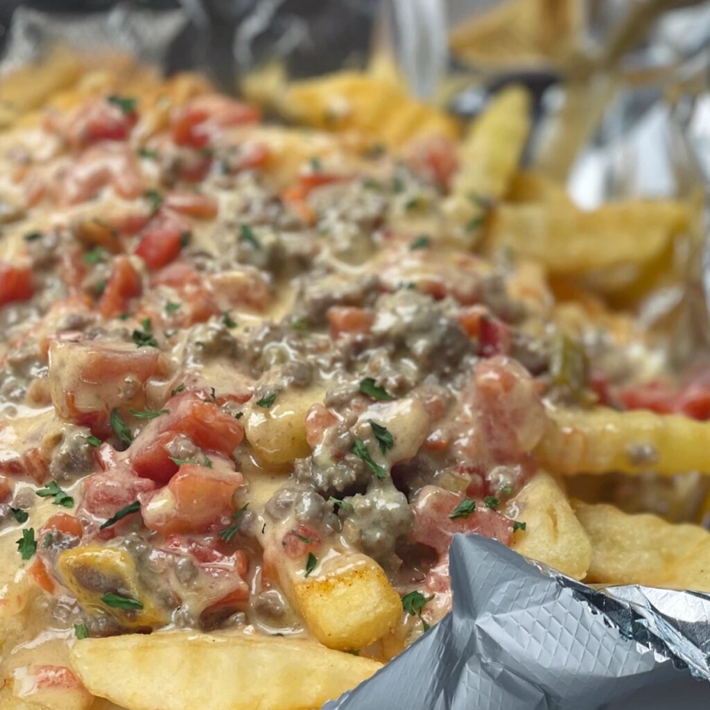 Rotel Fries is a beloved American comfort food that combines layers of crispy French fries w/ spicy Rotel tomatoes, green chilies, melted cheese, and optional toppings like sour cream, diced onions & jalapeños.